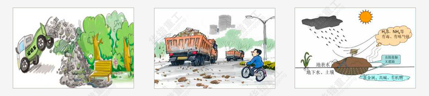 大多數城市建筑垃圾堆放地的選址在很大程度上具有隨意性,留下不少安全隱患。在外界因素的影響下,堆出現崩塌,阻礙道路甚至沖向其他建筑物的現象時有發生。 | 建筑垃圾在堆放和填埋過程中,由于發酵和雨水的淋溶、沖刷,以及地表水和地下水的浸泡而滲濾出的污水——滲濾液或淋濾液,造成周圍地表水和地下水的嚴重污染。 | 隨著城市的不斷發展,大量的建筑垃圾隨意堆放,不僅占用土地,而且污染環境,并且直接或間接的影響空氣質量。 | 隨著城市建筑垃圾量的增加,垃圾堆放點也在增加,而垃圾堆放場的面積也在逐漸擴大。 |